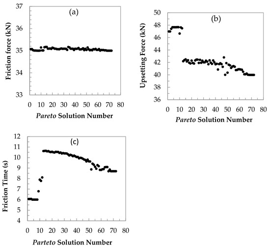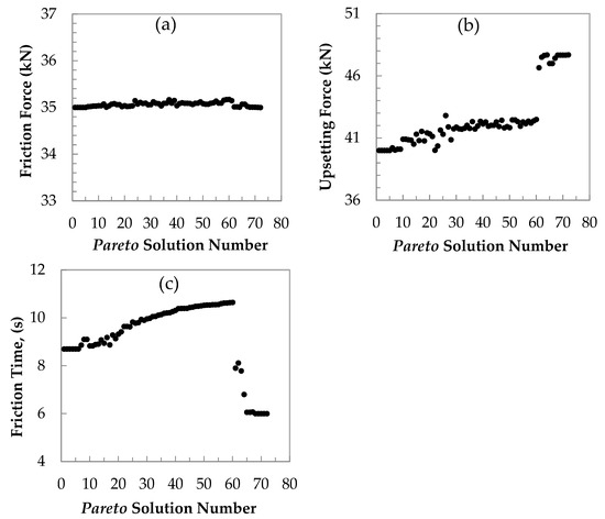 Figure 10 shows the predicted effects of friction force, upsetting force and friction time on the metal loss in the Pareto solution number. As expected, with increasing upsetting force and more shortening of metal in the considered area (A–B), UF decreases linearly from 42 to 40 kN, or logarithmically from 27 to 46%. After reaching 60 generations, the shortening value stabilises at an 8 mm level. The predicted pattern shows linearly decreasing metal loss with decreasing upsetting force and friction time [52,53].