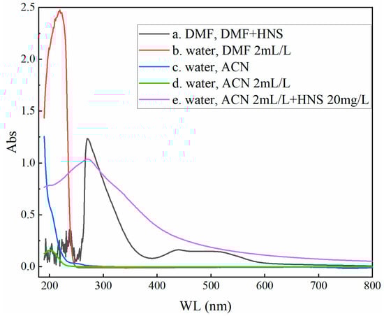 Using water as a baseline, full-wavelength scans of ACN were conducted, as shown in Curves c and d in Figure 1. Both ACN and its aqueous solution exhibited significant changes in absorbance at wavelengths below 260 nm. Similarly, using water as a baseline, the full-wavelength scans of dimethylformamide (DMF) and its aqueous solution showed similar results. To better represent real water samples, the DMF aqueous solution was selected for depiction in Curve b of Figure 1. This indicates that the absorbance of DMF is particularly high at wavelengths below 260 nm. Therefore, it is advisable to select a detection wavelength for HNS that is greater than 260 nm to minimize interference from the organic solvents. A full-wavelength UV scan of DMF + HNS was performed using DMF as the baseline, resulting in Curve a. This scan revealed a peak in absorbance at 271 nm. Consequently, this study selected DMF as the co-solvent. Furthermore, as depicted in Curve e of Figure 1, ACN is effective in extracting HNS from aqueous solutions, making ACN the preferred extraction solvent.