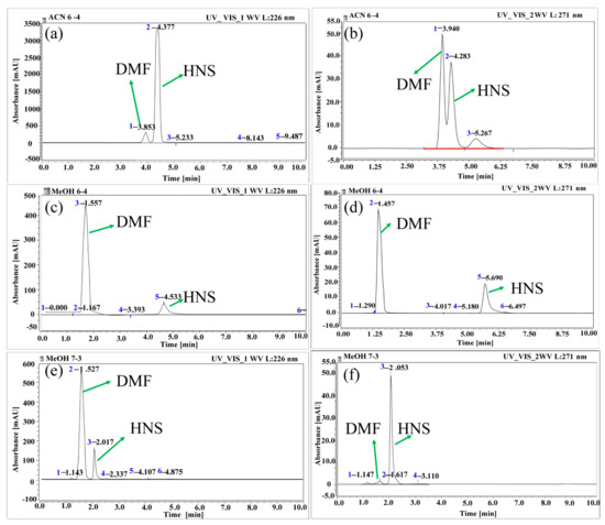 Presents high-performance liquid chromatography chromatograms of DMF and HNS at dual wavelengths using different mobile phases, ACN volume fraction of 60% (a) 226 nm (b) 271 nm; MeOH volume fraction of 60% (c) 226 nm (d) 271 nm; MeOH volume fraction of 70% (e) 226 nm (f) 271 nm.