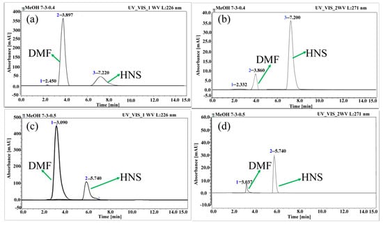 The column temperature was set to an ambient room temperature of 25 °C, with an injection volume of 20 µL. To minimize interference from impurity peaks on the main peak, the sample testing duration was adjusted to 15 min. The mobile phase consisted of a methanol (MeOH) volume fraction of 70% and an ultrapure water volume fraction of 30%. The mobile phase flow rates were tested at 0.4 mL/min, 0.6 mL/min, 0.8 mL/min, and 1.0 mL/min. The results indicated that overall performance, including peak shape, peak broadening, and retention time, was better at flow rates of 0.4 mL/min and 0.6 mL/min. Therefore, additional experiments were conducted at a flow rate of 0.5 mL/min, which revealed minimal differences between 0.5 mL/min and 0.6 mL/min. Optimal results are shown in Figure 3; chromatograms at other flow rates were similar. Compared to the results at a flow rate of 0.4 mL/min shown in Figure 3a,b, the outcomes at 0.5 mL/min presented in Figure 3c,d were notable. They showed shorter retention times for HNS and appropriate spacing between the DMF and HNS peaks. Predominantly, the chromatograms displayed only DMF and HNS peaks under dual-wavelength detection, with no impurity peaks.
