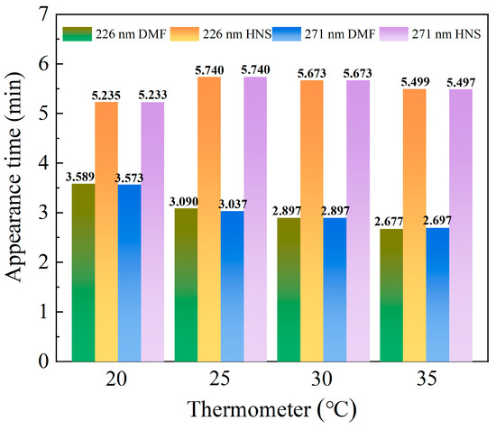 We assumed an injection volume of 20 μL and a retention time of 15 min. The mobile phase was set to a volume fraction of 70% MeOH and 30% ultrapure water, with a flow rate of 0.5 mL/min. Column temperatures were tested at 20 °C, 25 °C, 30 °C, and 35 °C. As shown in Figure 4, at a column temperature of 30 °C, the retention times for DMF and HNS, as well as the interval between these peaks, were found to be optimal. Additionally, under dual-wavelength detection, stability was highest at this temperature.
