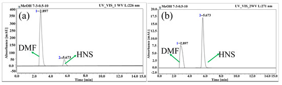 High-performance liquid chromatography chromatograms of DMF and HNS at dual wavelengths, with an injection volume set at 10 µL, (a) 226 nm (b) 271 nm.
