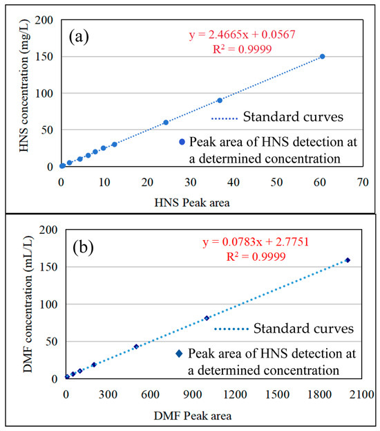 Depicts the standard curves correlating the concentrations of (a) HNS and (b) DMF with their respective peak areas.