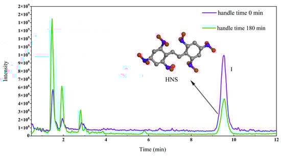 In this investigation, the research group utilized hydrodynamic cavitation (HC) technology combined with chlorine dioxide oxidation for the degradation of HNS. Wastewater samples for analysis were collected at the start (0 min) and end (180 min) of the reaction process. To verify the feasibility of the HPLC conditions, a gradient elution system using an ammonium acetate solution and acetonitrile in a 45:55 ratio, with a flow rate of 0.5 mL/min, was employed. The mass spectrometry conditions were set to the electrospray negative ion mode. The detection parameters for the HPLC-MS are listed in Table 8, and the results are presented in Figure 7 and Figure 8.