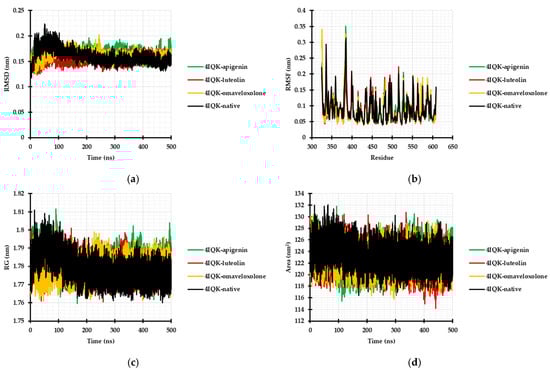 The 500 ns molecular dynamics (MD) simulation trajectories provide data for analyzing the root mean square deviation (RMSD), root mean square fluctuation (RMSF), radius of gyration (RG), and solvent-accessible surface area (SASA). Additionally, they offer insights into the binding energy of the protein−ligand complex throughout the MD simulation, calculated using the Molecular Mechanics with Generalized Born and Surface Area Solvation (MM-GBSA) method. These analyses contribute to understanding the stability and dynamic behavior of the protein−ligand complex over time, highlighting their potential interactions and efficacy in pharmacological applications. Overall, the MD simulation offers valuable insights into the molecular mechanisms underlying the binding affinity between the protein and ligand, aiding in rational drug design and optimization [24]. The stability metrics such as RMSD and RMSF help assess the flexibility and conformational stability of the complex, while SASA provides information on the extent of the protein−ligand interaction surface. Furthermore, the RG analysis complements these findings by offering insights into the compactness and overall shape of the complex throughout the simulation [25].