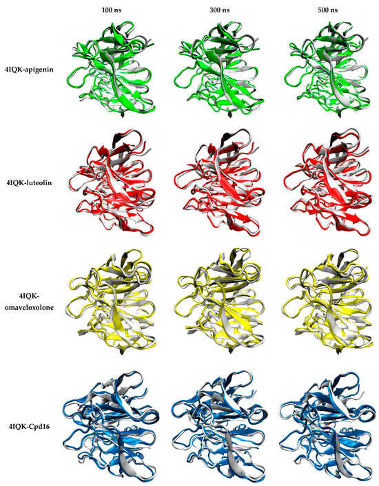 Depiction of the initial pose (white) and final pose (colored) from the molecular dynamics simulation in the 4IQK-ligand complexes: 4IQK-apigenin, 4IQK-luteolin, 4IQK-omaveloxolone, and 4IQK-Cpd16.