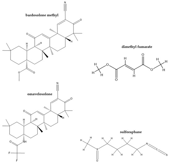 AutoDock Tools 4.2.6 was employed to conduct molecular docking, aligning ligands’ energy-minimized three-dimensional structures with target proteins’ energy-minimized structures [67]. The prepared ligands in .pdb format were converted to pdbqt format using the Python script prepare_ligand4.py version 3.13.1. from AutoDock Tools 4.2.6. Similarly, the energy-minimized structure of Keap1, Nrf2, and the ligands (apigenin, genistein, gossypetin, kaempferol, luteolin, phloretin, and quercetin) in .pdb format were converted to .pdbqt format using the Python script prepare_receptor4.py from AutoDock Tools 4.2.6. In this molecular docking study, comparators such as bardoxolone methyl (PubChem CID: 400769), dimethyl fumarate (PubChem CID: 637568), omaveloxolone (PubChem CID: 71811910), and sulforaphane (PubChem CID: 5350) were used to evaluate the binding effectiveness of the test ligands (Figure 10) [7,69]. For protein−ligand docking, the appropriate grid box was manually determined based on the search space center and size for both the protein and ligand, considering key residues crucial for the function and specificity of the proteases. For Keap1, the grid box was defined with a search space center of (−47.843, 4.168, −12.971) and a search space size of 64 Å × 60 Å × 60 Å. The molecular docking of the prepared ligands with the target protein was conducted using AutoDock Tools 4.2.6, employing the Lamarckian Genetic Algorithm (LGA) with 100 conformation searches. The best-docked pose, characterized by the lowest binding energy, was selected from the output of AutoDock Tools 4.2.6. Finally, the combined structure file in .pdb format of the docked protein−ligand complex, with the ligand in the best-docked pose, was analyzed using the Discovery Studio 2019 program [70,71].