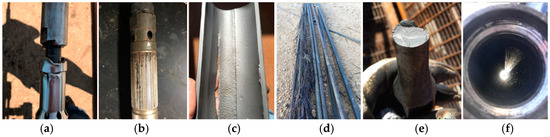 Different kinds of failure of rod, tube, and pump: (a) rod is broken at pump end; (b) plunger is pulled; (c) tubing is cracked; (d) rod is scattered; (e) rod is broken; (f) rod and tube are eccentric. (https://www.downholediagnostic.com/, accessed on 20 May 2024).