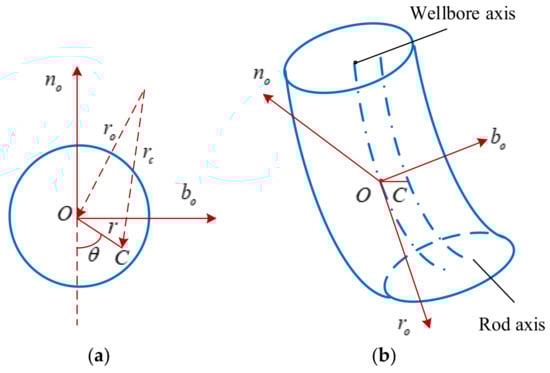 The geometric relationship of SRS deformation is shown in Figure 4. The plane is the normal plane of the well trajectory curve at point O; point C is the intersection of the plane and rod axis at time t; is the deflection angle; is the distance from the centre of SRS in the section to the centre of the wellbore; and and as geometric parameters describe the three-dimensional spatial position of point C deviating from point O.