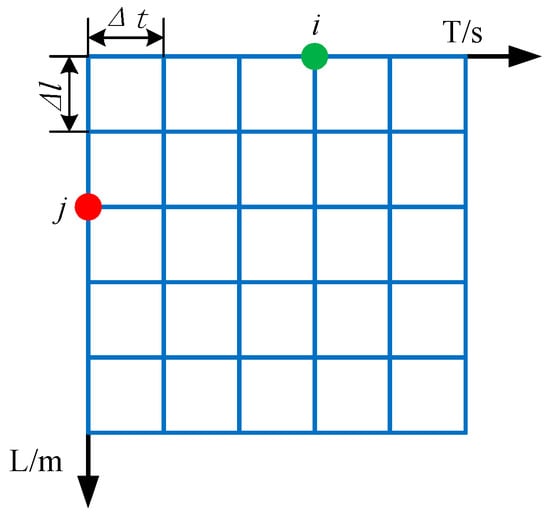 In this paper, the central difference method is used to discretise the SRS dynamics model. The numerical difference grid is shown in Figure 6. The vertical coordinate represents the well depth, and each node is represented by i totals of nodes, which is n + 1, and the step length is . The horizontal coordinate is the motion period T, the node is represented by j, and the step length is . To ensure the success of convergence, this formula must be satisfied, that is, and . In Figure 6, the green dot (i) represents a calculation point in the time direction, while the red dot (j) represents a calculation point in the spatial direction. These two dots are used in the numerical difference grid to indicate different calculation positions.