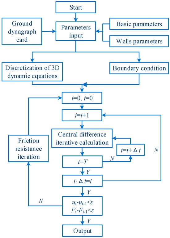 The motion processing of SRS is analysed, and the dynamometer cards are taken as the boundary condition; the input node’s load and displacement of the initial element are solved iteratively according to the discrete forms of the SRS dynamics model. Then, the displacement, transverse force, bending moment, and axial force of each element node are solved one by one. Finally, the stress and the bearing load of each node are obtained. represents a very small positive number used to control errors or determine the precision of numerical calculations. The iterative calculation process is shown in Figure 7.