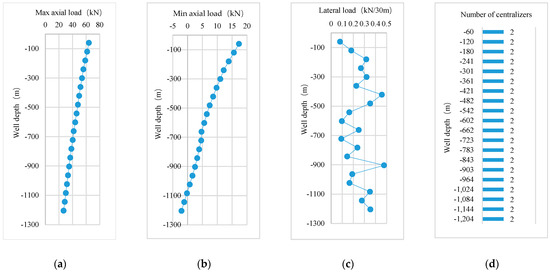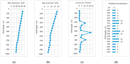 After three-dimensional mechanical design and calculation of SRS, the results are shown in Figure 9. It can be obtained from Figure 9a,b that maximum and minimum axial loads decrease with the well depth, which is mainly affected by the weight of SRS and the weight of the liquid column, but the minimum value is negative after 1084 m. It should be observed whether the pump jacking phenomenon occurs. From Figure 9c, there are several maxima of the lateral force of SRS along the well depth after 420 m, 900 m, and 1000 m. However, compared with case 1, the difference in the lateral force is small, and the effect of the centraliser is obvious. In Figure 9d, within the whole well depth, due to the small maximum amplitude of lateral force and the small difference in lateral force at each position, centralisers are set at 2/60 m, which are evenly distributed.