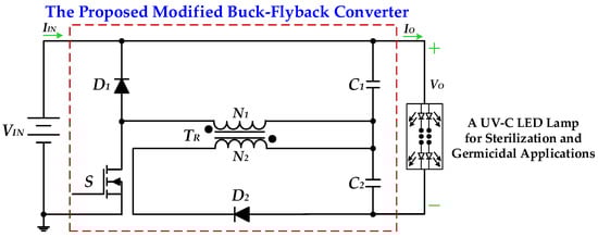 Figure 1 shows the proposed UV-C LED lamp driver circuit applied to a DC-input voltage source for sterilization and germicidal applications, which is named the modified buck–flyback converter; it integrates a buck converter with a flyback converter into a single-stage DC-DC power conversion topology and includes a power switch S, two diodes (D1 and D2), a transformer TR with a primary-side turn N1 and a secondary-side turn N2, two output capacitors (C1 and C2), and a UV-C LED lamp for sterilization and germicidal applications.