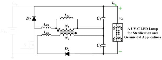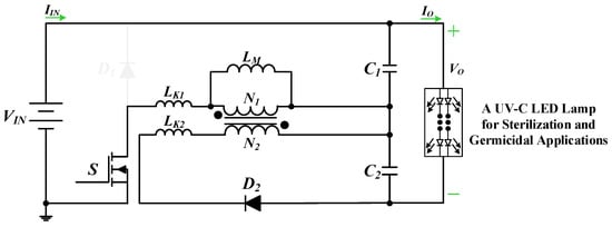 The equivalent circuit of the proposed UV-C LED lamp driver applied to a DC-input voltage source for sterilization and germicidal applications.