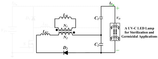 The equivalent circuit for operation mode 2 of the proposed UV-C LED lamp driver circuit applied to a DC-input voltage source for sterilization and germicidal applications.