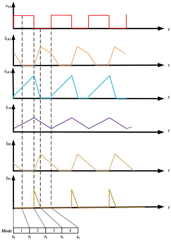 Figure 3, Figure 4, Figure 5, Figure 6 and Figure 7 show the operating modes and key waveforms of the UV-C LED lamp driver applied to a DC-input voltage source for sterilization and germicidal applications, respectively, and the operational analysis is described in detail below.