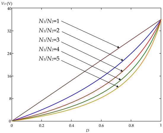 The output voltage VO versus the duty cycle D for various turns ratios N1/N2.