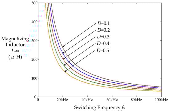 As stated by Equation (5), Figure 9 shows the relationship between the magnetizing inductor in the boundary conduction mode LMB and the switching frequency fS at different duty cycles D.