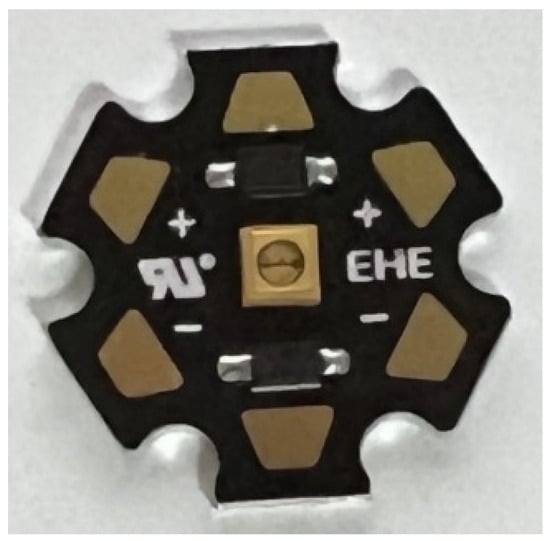 Figure 11 presents a photograph of the UV-C LED module for sterilization and germicidal applications used in the experiment. Table 1 presents the specifications of the UV-C LED module for sterilization and germicidal applications used in the experiment, and its information is as follows: the rated power is 0.33 W, the rated voltage is 10 V, the rated current is 33 mA, the wavelength is 275 nm, and the viewing angle is 120 degrees. Additionally, the “viewing angle”, which is also called the “azimuth angle”, is the luminous range of the LED light source, and the unit is “degree”. When the package of the LED light source is tilted to observe the change in the light output, the angle from the peak output value to the characteristic value of the angle that can be recognized, and the angle of half of the brightness of the peak output value, are multiplied by 2 (front side as the basis for left–right symmetry), which is known as the viewing angle.