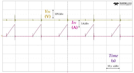 Experimental waveforms of input voltage VIN (10 V/div) and input current IIN (1 A/div); time scale: 10 μs/div.