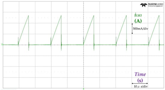 Experimental waveform of leakage inductor current iLK1 (500 mA/div); time scale: 10 μs/div.