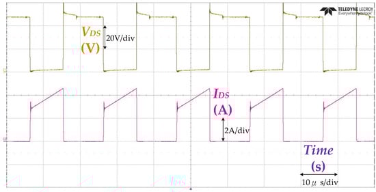 Experimental waveforms of switch voltage VDS (20 V/div) and current IDS (2 A/div); time scale: 10 μs/div.