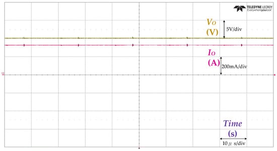 Experimental waveforms of output voltage VO (5 V/div) and output current IO (200 mA/div); time scale: 10 μs/div.
