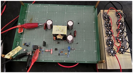 A photograph of supplying the experimental UV-C LED lamp for sterilization and germicidal applications with a prototype driver circuit applied to a DC-input voltage source of 18 V.