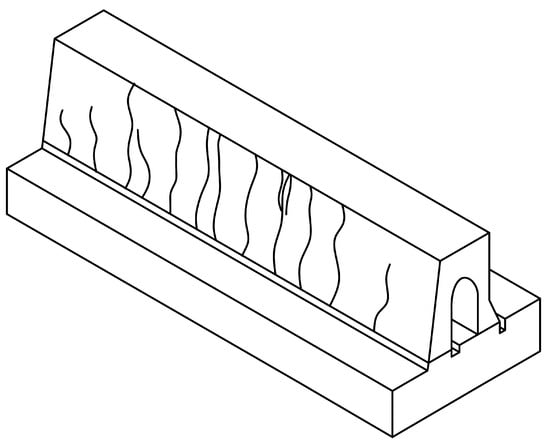 The object of the study in this article is a fragment of a dock wall with a length of 21,980 mm. The cross-section of the calculated structure is shown in Figure 1. Concreting of this structure was performed at average daily ambient temperature . The initial temperature of the concrete mix was 15 °C. The concrete had a class B22.5 in compressive strength according to Russian standards. An inspection of the block upon completion of the concrete work revealed the presence of numerous cracks, the location of which is shown in Figure 2. Most cracks start at the bottom of the wall and extend to the top. The cracks are vertical, meaning they are caused by normal stresses acting along the longitudinal axis of the wall.