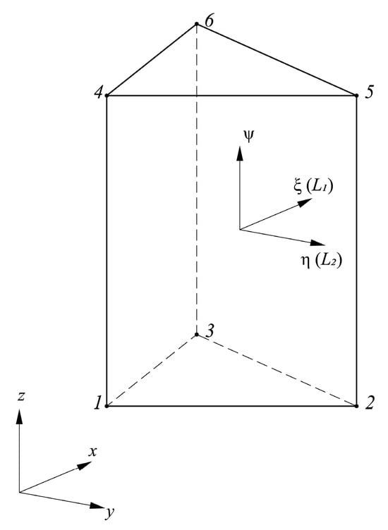 where are the L-coordinates of the triangle, is the dimensionless coordinate corresponding to the axis ( for nodes 1, 2, 3 and for nodes 4, 5, 6).