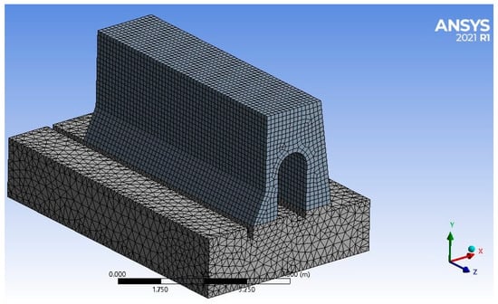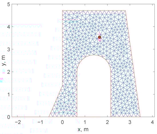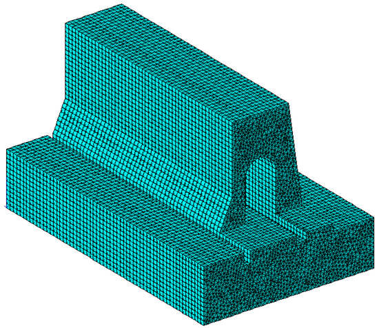 To analyze the causes of early crack formation, temperature fields and stresses were calculated using a program developed by the authors in the MATLAB R2024b environment, based on the finite element method. The analysis was performed in a three-dimensional formulation. Due to symmetry, half of the structure was considered. The structure was divided into 6-node volumetric prismatic finite elements (Figure 3). At the first stage, a mesh of triangles in the cross-section was generated using the PDE Toolbox package, and then three-dimensional bodies were formed by extrusion (Figure 4).