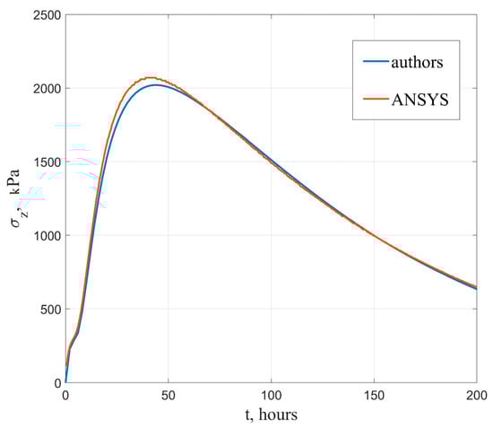 Figure 6 shows graphs of the change in time of maximum normal stresses obtained in the authors’ program and in ANSYS with a constant modulus of elasticity of fresh concrete. The maximum discrepancy between the results is 2.5%.