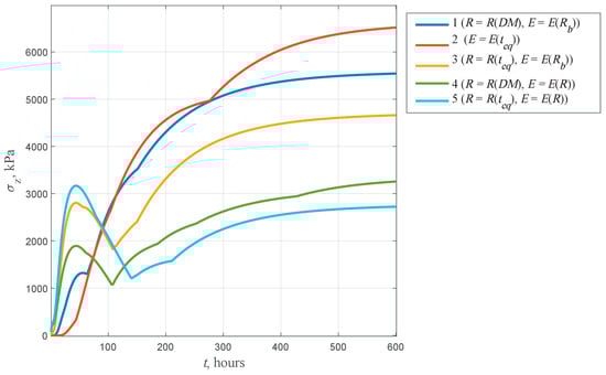 Figure 9 shows the change in the modulus of elasticity of concrete over time for the point marked in Figure 8 using calculation options 1–5. From Figure 9 it can be seen that the greatest discrepancy between the dependencies used to construct the E(t) curves is observed in the initial period of hardening up to 100 h. Since the stress at each moment in time is determined by adding up the stress increments for all previous time intervals, the result depends most significantly on how the modulus of elasticity of concrete changes in the early period of hardening. Most of the existing dependencies give reliable results at an age of concrete of at least 1–3 days. Further studies of changes in the concrete deformation characteristics at the age of up to 3 days are necessary to improve the calculation of the thermal stress state at the construction stage.