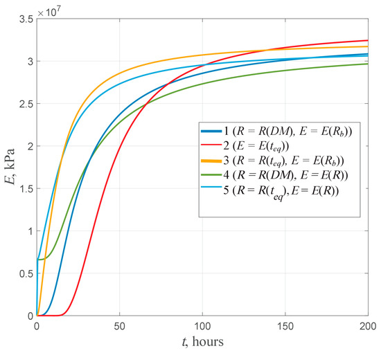 When calculating the stress–strain state, the dependence of physical and mechanical characteristics on the time and temperature at which hardening occurs was taken into account. Note that there are different approaches to specifying such dependencies.