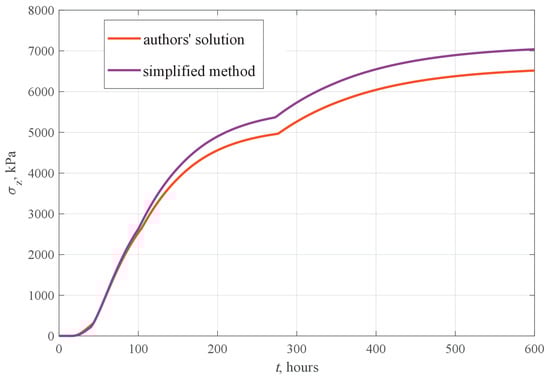 The authors’ solution is compared with the results of calculation using a simplified method, when the finite element analysis is initially performed with a constant elastic modulus over time, and then the stresses are recalculated to true ones. The discrepancy between the results for maximum stresses is 8%.