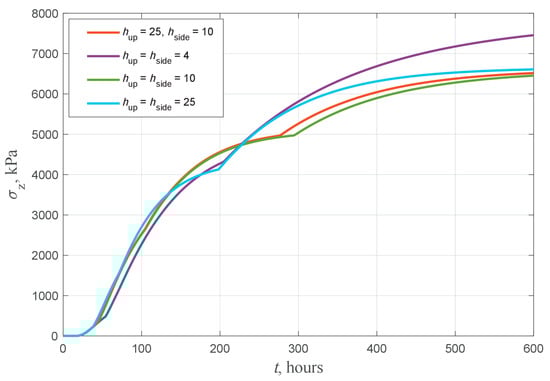 Another well-known method of reducing the risk of cracking at the construction stage is to reduce the temperature gradient between the center and the periphery of the structure. This can be performed, for example, by installing cooling systems inside the structure [32]. However, thermal insulation of surfaces is used more frequently [33], which is a less labor-intensive and economical method. Figure 12 shows graphs of the change in time of maximum tensile stresses at different values of the heat transfer coefficient on the side surfaces of the wall and on the upper surface . Compared with the original version ( and ), options and do not lead to a noticeable change in the maximum stresses. The option of insulating all surfaces leads to an increase in the maximum stresses. Thus, the method of insulating surfaces, effective for foundation slabs, turns out to be ineffective for the considered example of the dock wall. This can be explained by the fact that in this problem the maximum stress depends not only on the temperature gradient between center and periphery of the structure but also on the absolute value of the maximum temperature, since the wall is rigidly connected to the foundation slab made of old concrete. The foundation slab acts as an external restraint for the wall, and cracks are usually initiated at the junction of the foundation and the wall [34,35].
