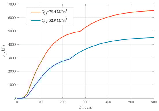The possibility of reducing the risk of early cracking by reducing the heat release of concrete was also investigated. Figure 13 shows a graph of the change in time of maximum stresses for the initial version, as well as in the case of a 1.5 times reduction in concrete heat release. With a 1.5 times reduction in Q28, the maximum stress decreases by 45%.