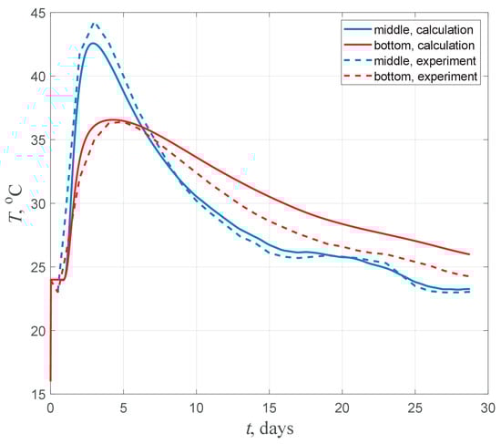 The calculation took into account daily changes in ambient temperature. The average daily ambient temperature was 17.5 °C, the maximum temperature was 28.7 °C, and the minimum temperature was 9.8 °C. The heat release function was given by expression (24) at = 51.7 MJ/m3, , .