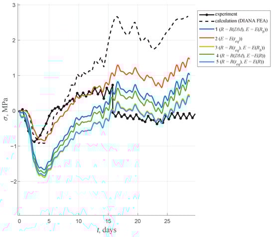Figure 15 shows a comparison of the experimental values of stresses in the center of the foundation slab in the middle of the thickness with the calculation results for options 1–5. This graph also shows the calculation results with the use of DIANA FEA 10.2 software presented in [23]. In paper [23], the dependence of the concrete elastic modulus on the equivalent age was specified using Formula (11). From Figure 15 it can be seen that, at the age of up to 2 days, there is good agreement with the experimental data when specifying the dependence of the concrete elastic modulus on time for options 1, 3–5. At the age of 9–16 days, when significant tensile stresses begin to appear, the calculation results for option 2 are in better agreement with the experimental data. After 16 days, the stresses on the experimental curve drop to almost zero, which is probably due to the formation of a crack. Figure 15 also shows that the calculation results in the authors’ program for option 2 are in better agreement with the experimental data than the results presented in [23].