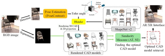 The 3D CAD model retrieval problem is to search for a CAD model from CAD datasets, which is the best matching with an input RGB object. Conventional CAD retrieval methods mostly address the search for matching CAD models from RGB or RGB-D images []. However, there are few studies of simultaneous searching for the best CAD model and estimating the 6-DoF pose of an input RGB image [,]. Park et al. [] and Gümeli C. et al. [] introduced frameworks similar to the proposed method. These methods detect an RGB object from an input image, estimate the 4-DoF or 6-DoF pose, and search the matching CAD model. Because each problem of 6-DoF pose estimation and CAD model retrieval from an input RGB is inherently not easy, simultaneous pose estimation and CAD model retrieval has not been commonly addressed.
