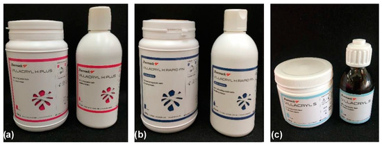 Zhermack® acrylic resins. (a) Villacryl H Plus V4, (b) Villacryl H Rapid FN, and (c) Villacryl S.