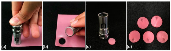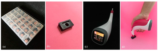 Measurements were conducted over a pink cardboard background to simulate mucosal color, and a black PVC device was used to neutralize ambient light during the measurement process (Figure 7b). This device was placed over each specimen, and the VITA Easyshade V® tip was inserted through its opening to ensure that consistent readings were taken from the specimen’s center (Figure 7c,d). The pink cardboard color was defined as the baseline for all measurements.