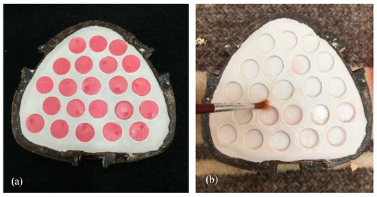 Next, a flask was lubricated with petroleum jelly and filled with Type II gypsum (Pro-solid, Saint-Gobain Formula, Newark, UK). After waiting for 1 min, the wax patterns were positioned on the gypsum and gently pressed to ensure that only their marked surfaces remained visible (Figure 3a). Once the setting reaction was complete, the flask was closed, and the counter-flask was filled with type III gypsum (Pro-solid Super, Saint-Gobain Formula, UK). After the type III gypsum had set, the flask was placed in a wax elimination machine (Mestra, Biskaia, Spain) at 80 °C for 10 min. Subsequently, the flask was opened, wax residues were removed, and two layers of separating medium (Ivoclar Vivadent, Schaan, Liechtenstein) were applied to both sides of the flask (Figure 3b).