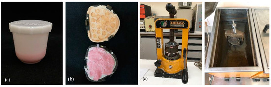 Subsequently, the flask was clamped and immersed in preheated water of a polymerization unit (Reco Dental, Wiesbaden, Germany) (Figure 4d), then heated until the temperature, time, and pressure recommended by the manufacturer were reached (Table 1). Finally, the flask was removed and cooled to room temperature, and the specimens were carefully extracted.
