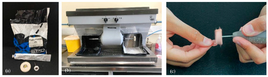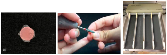 After obtaining all the specimens, the excess material was removed using a tungsten carbide bur mounted on a handpiece (Figure 5a,b). The sides of the specimens were then polished with 500-grit and 1000-grit sandpaper using a manual polishing machine Lunn Major (Struers, Ballerup, Denmark) under constant water cooling (Figure 5c). The correct thickness was confirmed with a digital micrometer (Fischer Darex, Le Chambon Feugerolles, France).