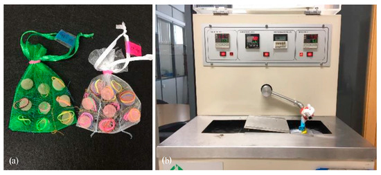 (a) Mesh bags with specimens separated and identified by colored rubber bands; (b) thermocycling machine.