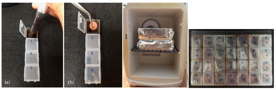 (a) Dispensing 4 mL of coffee using a graduated syringe; (b) immersion of the specimen in the beverage; (c) specimens wrapped in aluminum foil in an oven at 37 °C; (d) boxes containing specimens immersed in the beverages.