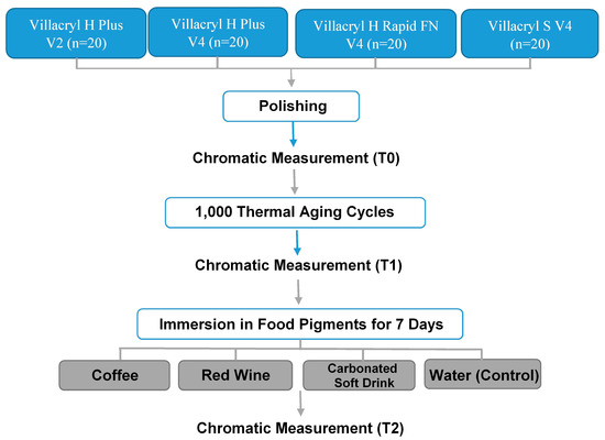 Factors such as prosthesis brushing, pigment dilution in saliva [22], abrasion resulting from use [3], the wide variety of beverages (tea) and foods ingested (red berries, turmeric, tomato sauce, etc.), the influence of enzymes and proteins present in saliva, pH changes in saliva [29,38], and functional and parafunctional forces [24] were not considered in this study, but they significantly impact the color stability of dental prostheses.