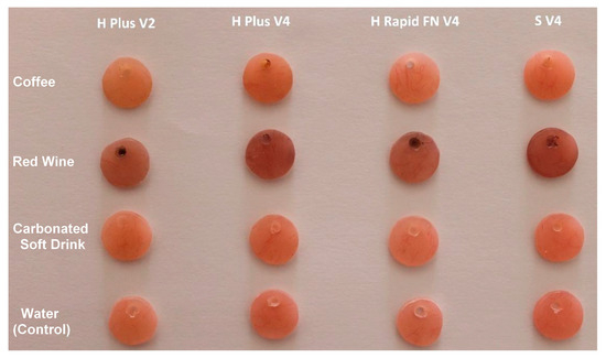The color changes resulting from the subsequent immersion of the specimens in different beverages can be observed in detail in Table 3 and Figure 14. In Table 3, the multiple comparisons (MCs) row includes only the pairs of categories with statistically significant differences. It was observed that comparisons between beverages showed statistically significant differences, regardless of the resin type (p < 0.05).