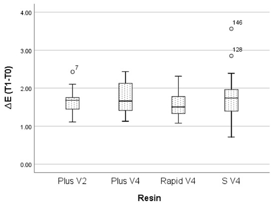 Box plots of ΔE (T1–T0) by Villacryl resin category after thermocycling. (° represents outliers).
